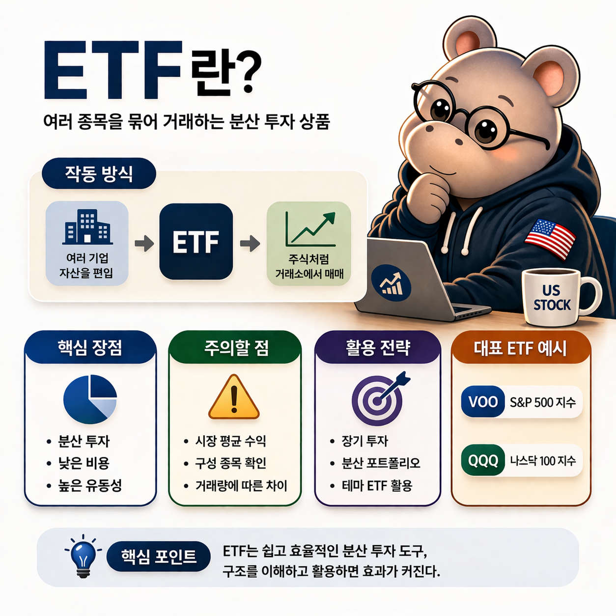 ETF는 여러 자산을 하나의 바구니에 담아, 이를 주식처럼 거래할 수 있도록 만든 금융 상품이다. 투자자는 ETF를 매수함으로써, 그 안에 포함된 모든 자산에 동시에 투자하는 효과를 얻는다. 이러한 구조는 개별 종목을 직접 선택하지 않아도, 시장 전체나 특정 산업에 투자할 수 있게 해 준다. 특히 미국 주식 시장에서는 다양한 ETF가 존재하기 때문에, 투자 선택의 폭이 매우 넓다.